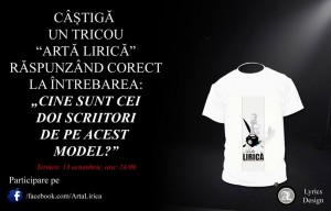 Tot ce trebuie să faci, este să răspunzi corect la întrebarea: „CINE SUNT CEI DOI SCRIITORI DE PE FAȚA TRICOULUI”, printr-un comentariu la postarea pe pagina de facebook https://www.facebook.com/ArtaLirica. Câștigătorul va fi desemnat prin tragere la sorți. Concursul se va încheia pe data de 13 octombrie, ora 24. Mult succes tuturor!