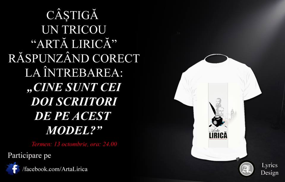 Tot ce trebuie să faci, este să răspunzi corect la întrebarea: „CINE SUNT CEI DOI SCRIITORI DE PE FAȚA TRICOULUI”, printr-un comentariu la postarea pe pagina de facebook https://www.facebook.com/ArtaLirica. Câștigătorul va fi desemnat prin tragere la sorți. Concursul se va încheia pe data de 13 octombrie, ora 24. Mult succes tuturor!