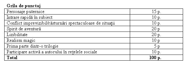 Participarea activa la retelele de socializare n-are nimic comun cu nivelul literar al lucrarii prezentate, deci n-ar trebui sa contribuie la punctaj. Entuziasmul literar nu inseamna si valoare literara. Pe de o parte, ” Se acceptă numai manuscrise de proză, de la autori care nu au mai publicat nicio carte cu ISBN până la data de 20 iulie 2014″ iar pe de alta ” este recomandată trimiterea unui CV literar, a unui link către pagina de Facebook a autorului și a unei scrisori de intenție prin care se motivează înscrierea.” Ce poti scrie intr-un CV literar ? Ca ai manuscrise de sertar citite si aplaudate in cenacluri ? Sau ca ai publicate niste carti ? „descriere narativă a cărții de maxim 1000 de semne cu spații ” nu cumva ajuta juriul la o selectie „usoara” ? Exeplu ” ia uita-te domne ce subiect tampit de roman a trimis asta ! Nici nu mai are rost sa pierd timpul sa citesc !” Nu uitati ca marile opere se pot caracteriza si in 2 sau 3 fraz,e a caror citire induce, de cele mai multe ori, o concluzie gresita despre valoarea scrierii.