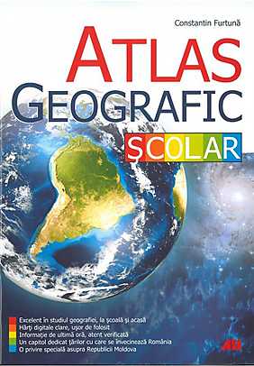 Atlasul geografic şcolar este excelent în studiul geografiei, la şcoală şi acasă. Include hărţi digitale clare, uşor de folosit, informaţii de ultimă oră, atent verificate şi un capitol dedicat ţărilor cu care se învecinează România, cu o privire specială asupra Republicii Moldova.