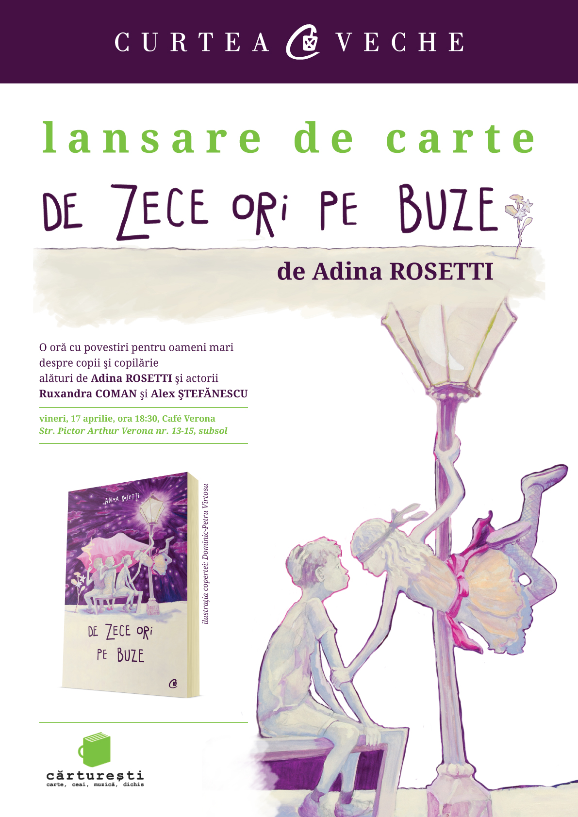 Volumul va fi lansat pe 17 aprilie la ora 18.30 la Café Verona (Str. Pictor Arthur Verona nr. 13-15 – subsolul Librariei Carturesti Verona). Alaturi de Adina Rosetti, actorii Ruxandra Coman si Alex Stefanescu le vor reaminti celor prezenti de ce povestirile este bine sa fie citite la orice varsta. Intrarea la eveniment va fi libera.