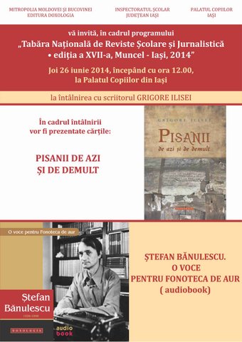 Joi, 26 iunie 2014, de la ora 12.00, la Palatul Copiilor din Iaşi va avea loc o întâlnire între elevii care participă la a XVII-a ediție a Taberei Naționale de Reviste Școlare și Jurnalistică, Muncel-Iași și scriitorul Grigore Ilisei.