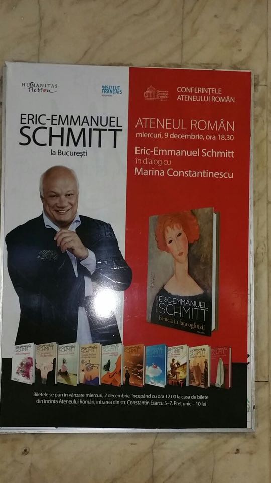 Ateneul Român. Miercuri, 09 Decembrie 2015, 18:30 – 20:00. Sala mare. Eric Emmanuel Schmitt în dialog cu Marina Constantinescu. Bilete se pun în vânzare miercuri, 2 decembrie începând cu ora 12.00, la casa de bilete din incinta Ateneului Român, intrarea din strada Constantin Enescu, nr 5-7. Preț unic-10.00 Lei.