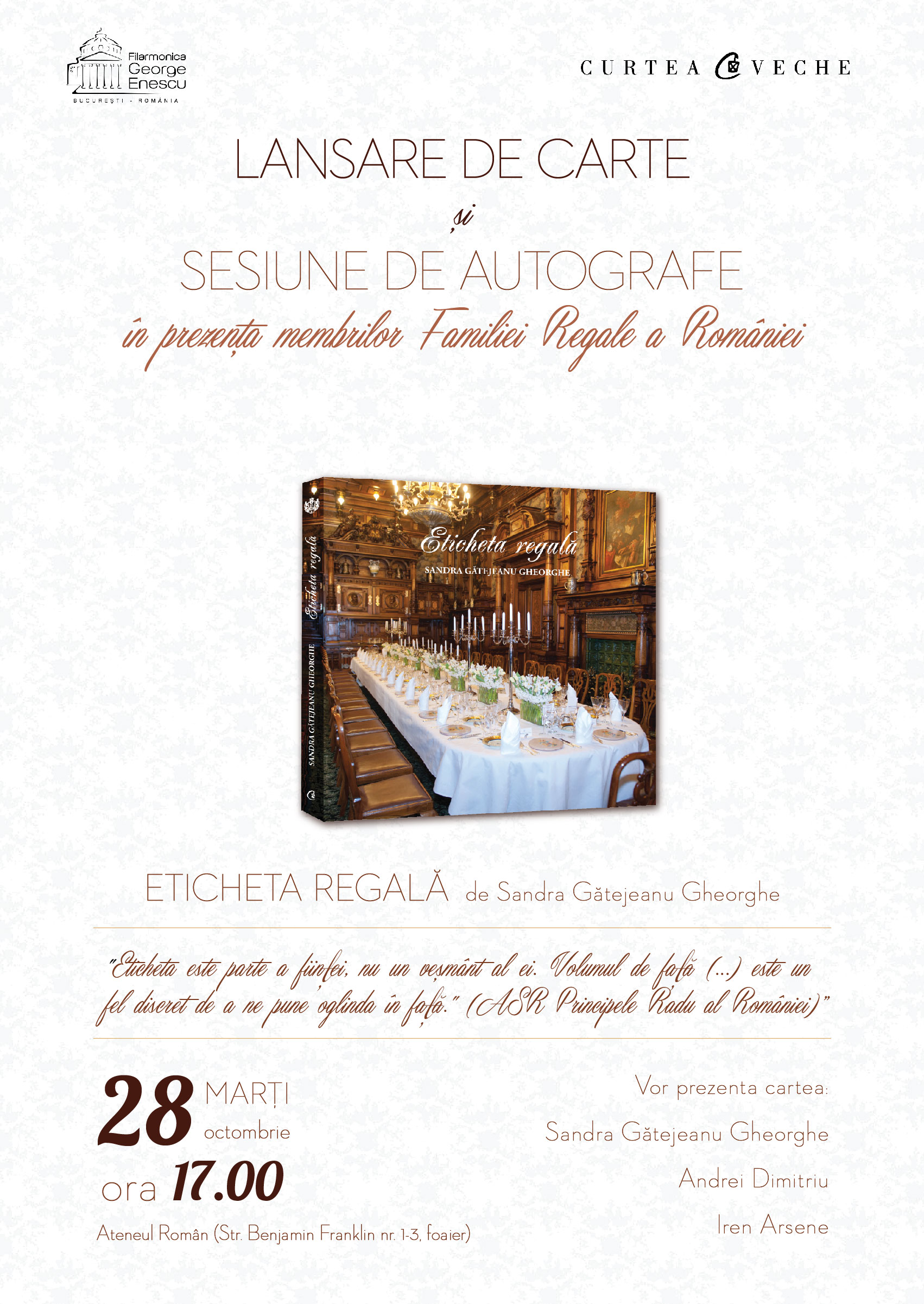 Curtea Veche Publishing și Filarmonica “George Enescu” vă invită la evenimentul de lansare a volumului “Eticheta regală” de Sandra Gătejeanu Gheorghe. Evenimentul va avea loc marți, 28 octombrie, începând cu ora 17.00, la Ateneul Român (Str. Benjamin Franklin nr. 1-3, foaier), în prezența membrilor Familiei Regale. Intrarea va fi liberă.