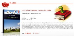 Devorator de cărţi şi veşnic pofticios, eu, Ilă Citilă, m-am gândit să cobor din înaltul Netului şi pe pământ. De mâine, în fiecare librărie Diverta (şi pe newsletterul reţelei), mă vei găsi printre rafturi recomandând cartea săptămânii. Pentru că mi-e drag de autorii români, cu nimic mai prejos decât cei occidentali, m-am gândit să propun spre lectură combatanţilor apţi pe câmpul de cuvinte să lupte alături de personajele lui Andrei Ruse, din Dilăr pentru o zi, Radu şi Nebunul.