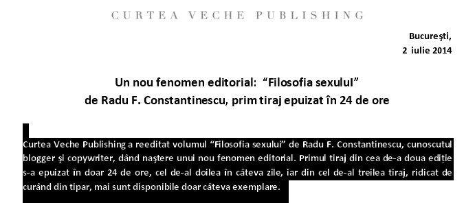 fenomen editorialNu ştiu cum vând alţii, dar PR-ul editurii cu nume din Mateiu Caragiale a întrecut Times New Roman la glume coapte. Jurata editurii a scris sub semnătură că Radu F. Constantinescu, „cunoscutul blogger şi copywriter”, a dat naştere unui nou fenomen editorial. Nu ştim dacă zămislirea a fost prin cezariană sau fătare clasică.