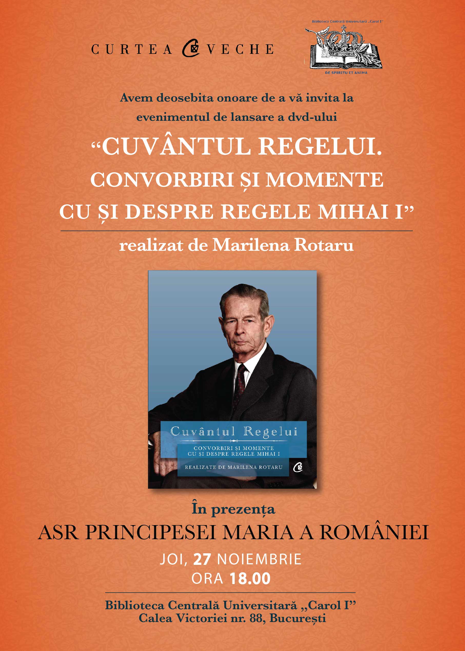 Curtea Veche Publishing și Biblioteca Centrală Universitară “Carol I” din București vă invită la evenimentul de lansare a dvd-ului “Cuvântul Regelui” realizat de Marilena Rotaru. Evenimentul va avea loc joi, 27 noiembrie, începând cu ora 18.00, în Aula Bibliotecii Centrale Universitare „Carol I” (Calea Victoriei nr. 88), în prezența Alteței Sale Regale Principesei Maria a României. Intrarea va fi liberă.