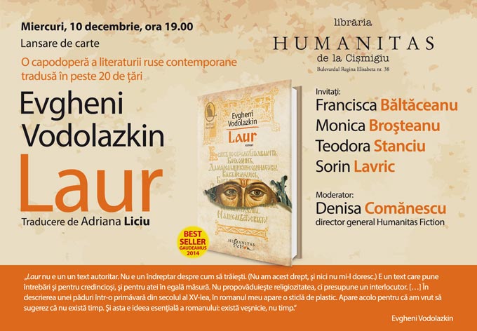 Lansarea romanului Laur de Evgheni Vodolazkin – miercuri, 10 decembrie, ora 19, Librăria Humanitas de la Cişmigiu