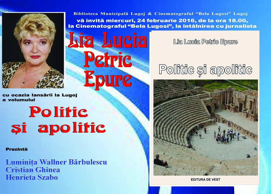 Acum, jurnalista Lia Lucia Petric Epure le propune lugojenilor volumul “Politic şi apolitic”, carte care va fi lansată miercuri, 24 februarie 2016, de la ora 18.00, la Cinematograful “Bela Lugosi”, în organizarea Bibliotecii Municipale Lugoj. Despre carte şi despre autoarea ei vor vorbi: Luminiţa Wallner Bărbulescu – istoric, Cristian Ghinea – scriitor şi jurnalist – şi Henrieta Szabo – directoarea bibliotecii.