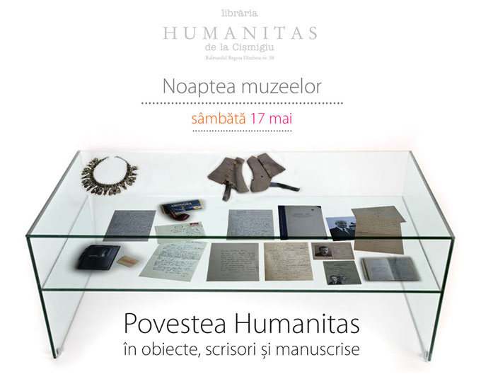 Editura Humanitas îşi deschide arhivele şi instalează în librăria Humanitas de la Cişmigiu o vitrină a nostalgiei culturale. Va fi una dintre opririle de pe traseul Nopţii Muzeelor şi va conţine obiecte, scrisori sau caiete de însemnări care au aparţinut lui Constantin Noica, lui Alexandru Dragomir, lui Martin Heidegger, lui Mircea Eliade, Monicăi Lovinescu sau lui Virgil Ierunca şi fragmente de manuscris ale lui Emil Cioran, Lucian Boia, Ioana Pârvulescu, Andrei Pleşu, Mircea Cărtărescu, Dan C. Mihăilescu, Horia-Roman Patapievici şi Gabriel Liiceanu. Le preţuim pentru că fac parte din istoria unei perioade, purtătoarele emblematice ale modei, obiceiurilor sau gândurilor împărţite, notate şi publicate de elitele ei.