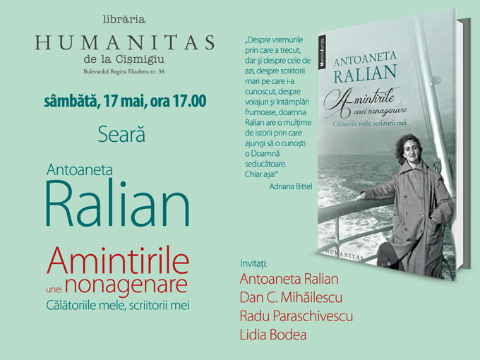 Seară Antoaneta Ralian – Amintirile unei nonagenare – Librăria Humanitas de la Cişmigiu, 17 mai, ora 17