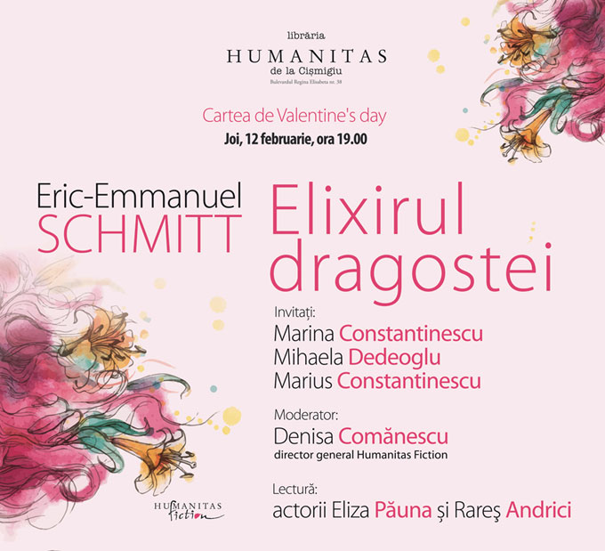 Seară Eric-Emmanuel Schmitt, Elixirul dragostei , joi, 12 februarie, ora 19, Librăria Humanitas de la Cișmigiu.